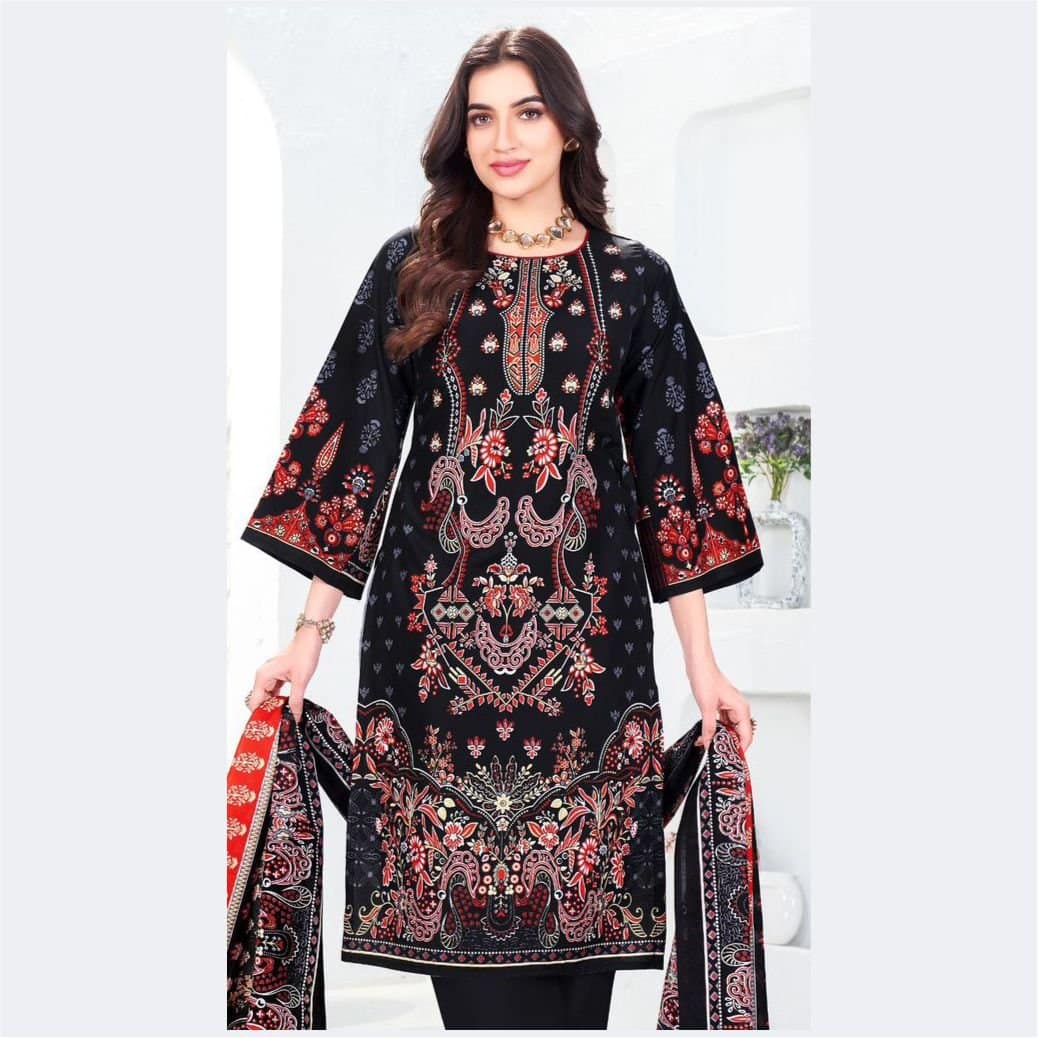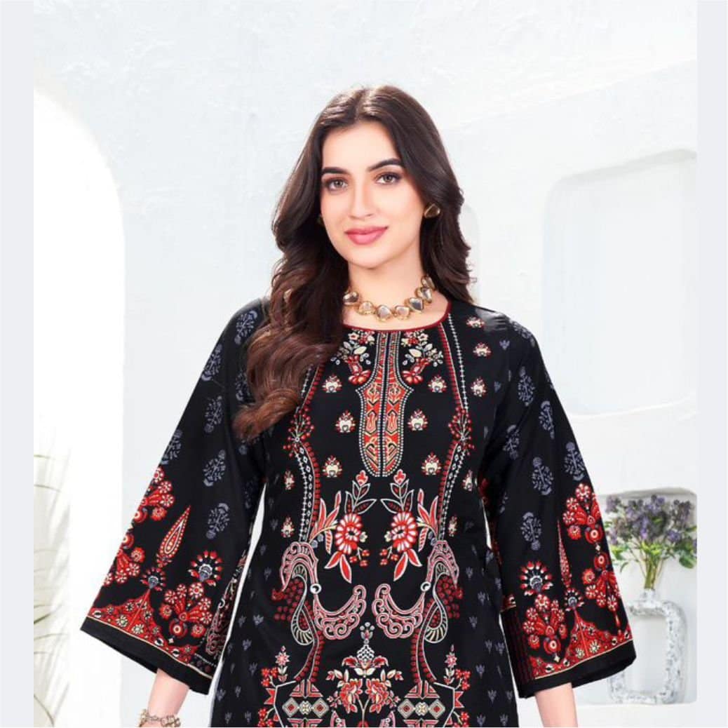 Black Pakistani Print Cotton Salwar Suit Material | Unstitched Embroidered Dress Fabric with Printed Dupatta | Women’s Ethnic Wear | Fabiha Fashion