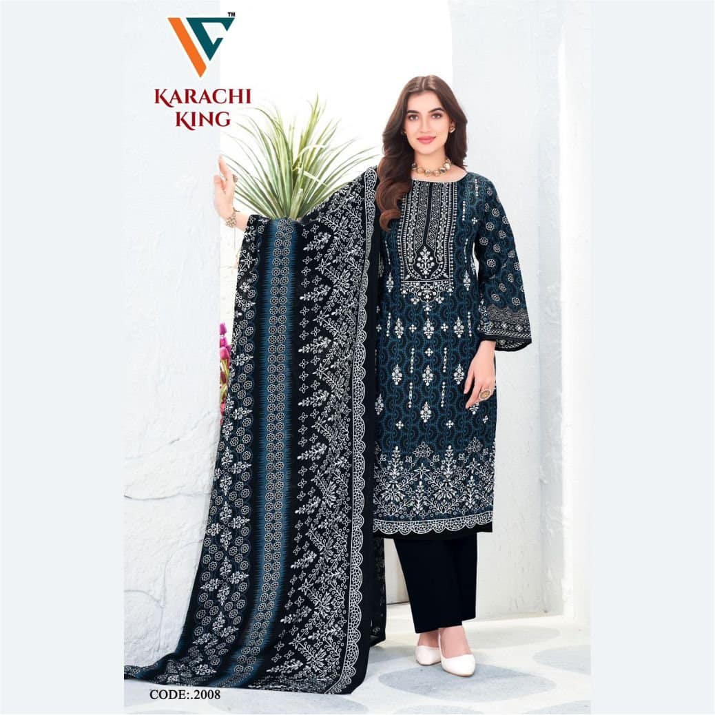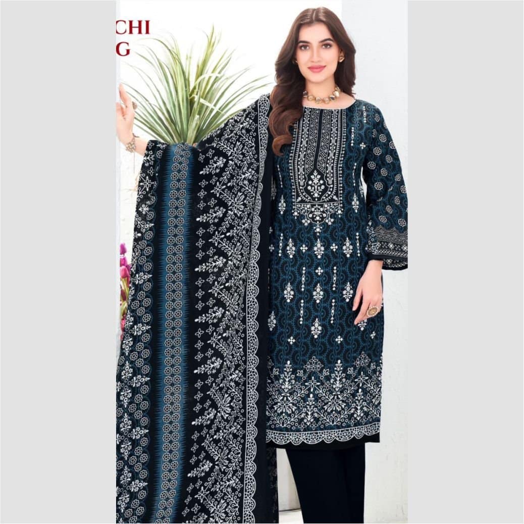 Elevate your ethnic wardrobe with this exquisite dark grey-blue Pakistani print cotton salwar suit material. Featuring intricate embroidery and a matching printed dupatta, this unstitched set is perfect for weddings, festivals, and special occasions.