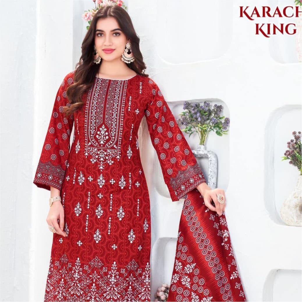 Enhance your ethnic wardrobe with this exquisite deep red Pakistani print cotton salwar suit material. Featuring intricate embroidery and a matching printed dupatta, this unstitched set is perfect for weddings, festivals, and special occasions.