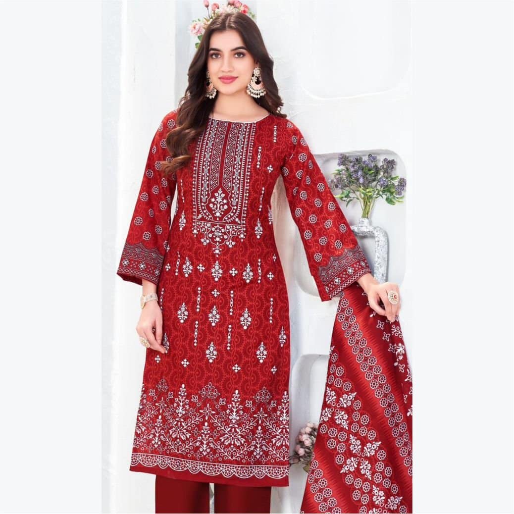 Deep Red Pakistani Print Cotton Salwar Suit Material | Unstitched Embroidered Dress Fabric with Printed Dupatta | Women’s Ethnic Wear | Fabiha Fashion